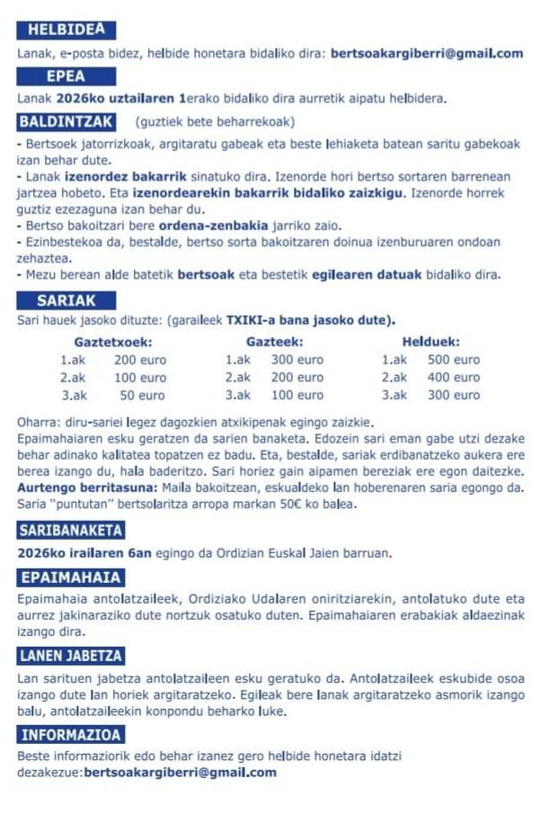 - Sorta osatzeko bertso kopurua: 8tik 12ra bitartekoa.