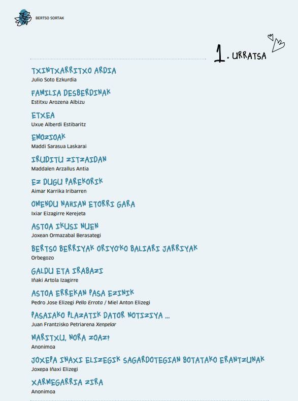 9-11 urteko ikasleekin lantzeko bertso sorten antologia. Bat-batean jarduteko baliagarriak izango zaizkigun doinuak ere ikasiko ditugu bertso sorta hauen bidez. Iraganeko bertsolariak, pasadizoak eta historiako gertaerak zein egungo bertsolariak eta gaiak lantzeko bide ere emango digute.